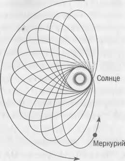 Рис. 4.20. Эллиптическая орбита Меркурия постоянно поворачивается в своей плоскости. На рисунке вытянутость орбиты и скорость ее вращения значительно усилены для наглядности.