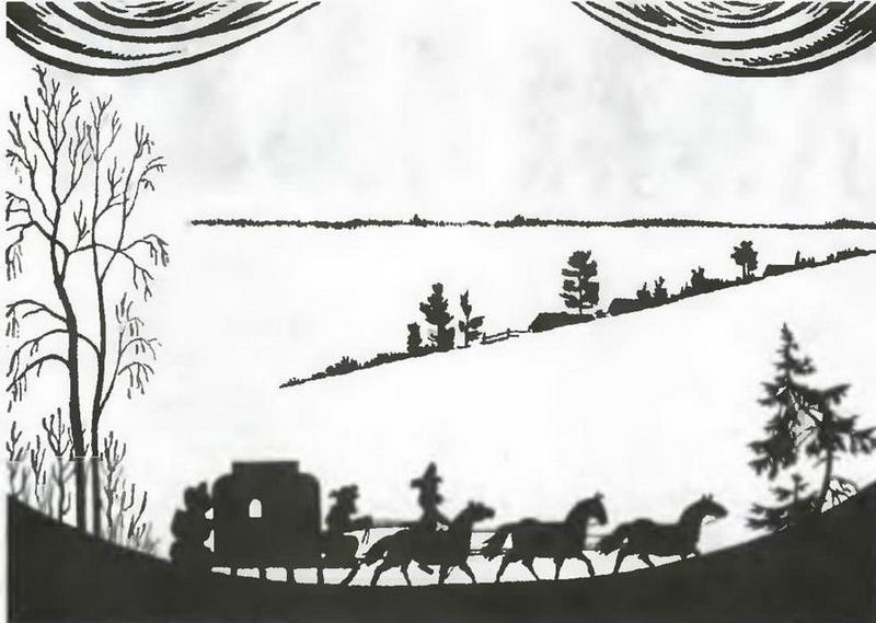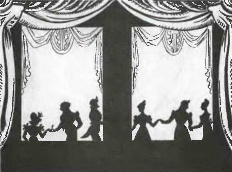 С.Серпинский, Н.Берман и Е.Шершнева, без сомнения, были знакомы с силуэтами Гельмерсена. От него они скорее всего восприняли мысль о теневом воплощении бытовой жизни пушкинских героев, но уже не в книжной графике, а на сцене школьного театра. Я не искусствовед, но мне кажется, что силуэты художниц тоньше, «женственнее» более «плотных» теней Гельмерсена.