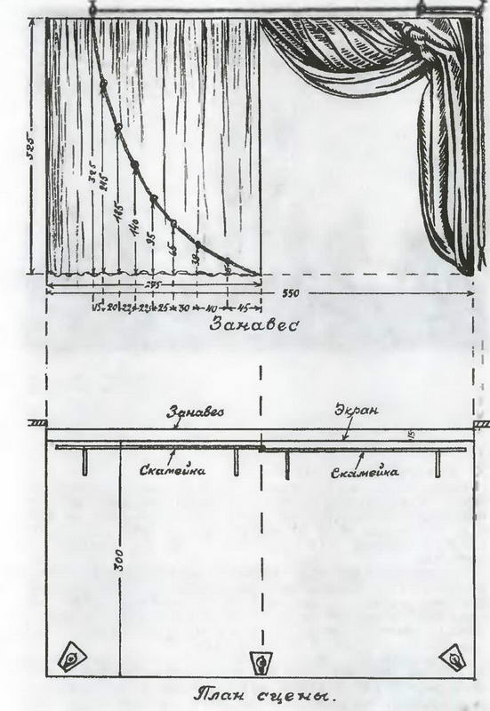 Масштаб школьного теневого театра был достаточно внушителен. На первом рисунке представлены план сцены, ее устройство и устройство занавеса. Видно, что сцена должна была быть высотой более трех метров, а шириной более пяти с половиной метров. Она оснащалась сильными светильниками и экраном. На одном из рисунков сохранилась карандашная надпись, содержащая рекомендации по устройству театра, где указывается ширина экрана — не менее восьми метров.
