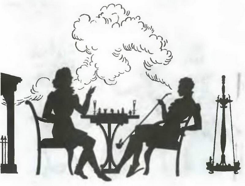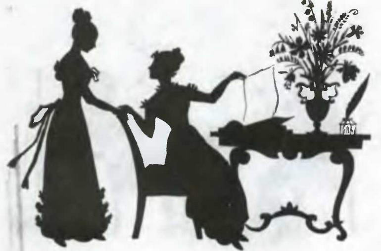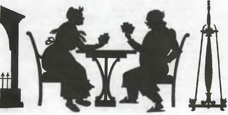Был в жизни художниц один эпизод: увлеклись они тенями, силуэтами. Почти два десятка иллюстраций к поэме Пушкина «Евгений Онегин» для статьи их давнего знакомого С. В. Серп и нс кого о школьном театре теней они подготовили к печати в 1948 году. Но и статья, и силуэты были объявлены «формалистическим» вывертом и запрещены к публикации. Посмотрите на эти рисунки. Почти все они хорошо узнаваемы. Подписи к ним не сохранились, но я почти полностью уверен, что нашел соответствия между рисунками и текстом «Евгения Онегина».