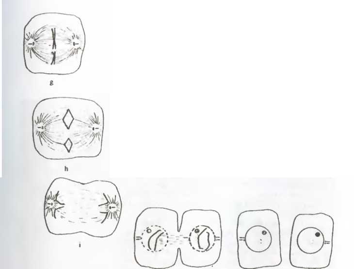 При митозе, или клеточном делении, все процессы (рис. 18 b-j) сводятся к декомпартментализации клетки. Это отчетливо видно на рис. 18, где показано растворение ядерной мембраны (сопровождающееся репликацией больших молекул ДНК, имеющих вид двойных спиралей) и смещение хромосом и других клеточных компонентов, что делает возможным появление плоскости раздела. Все это происходит в результате клеточного аутопоэза, который при этом не прерывается. Та ким образом, собственная динамика клетки ведет к структурным изменениям, например, к образованию митотического веретена (рис. 18 d-h). Такие изменения приводят к дроблению, или делению клетки.