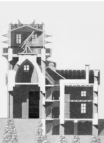 Рис. 3.18. 200-дюймовый рефлектор «Хейл» обсерватории Маунт-Паломар: внешний вид и внутреннее устройство телескопа и его башни. Рисунки Р. У. Портера, выполненные по рабочим чертежам в 1939 г.