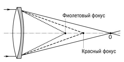 Рис. 3.9. Ахроматический двухлинзовый объектив. Пунктирные линии показывают ход лучей в том случае, если бы свет прошел только сквозь положительную линзу. Вторая, отрицательная линза обладает сильным обратным хроматизмом. Она удлиняет фокусное расстояние и сводит оба цвета в одном фокусе (0).