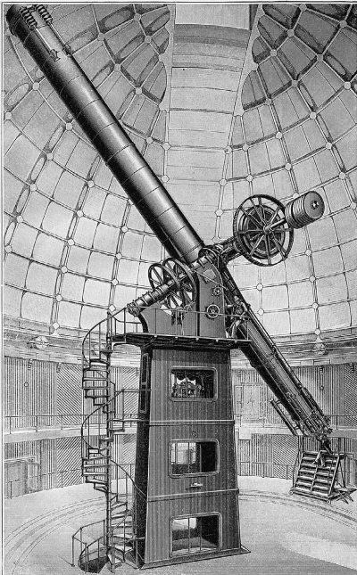 В то время как технология изготовления рефлекторов во второй половине XIX в. быстро совершенствовалась, эволюция рефрактора практически остановилась. Современные рефракторы мало изменились с эпохи Фраунгофера. Правда, улучшились качество и ассортимент оптического стекла, но полностью победить хроматическую аберрацию все равно не удалось. Ее сводят к минимуму лишь в небольшой области спектра: в желто-зеленой, если телескоп предназначен для визуальных наблюдений, и в голубой, если для фотографических. Оба крупнейших в мире рефрактора, Ликский и Йерксский, – визуальные, с объективами диаметром около 1 м. Оба были построены в конце XIX в. и установлены на экваториальных монтировках немецкого типа, какие делал Фраунгофер. Заготовки для линз их объективов были отлиты во Франции, а сами объективы изготовила знаменитая американская фирма «Алван Кларк и сыновья».