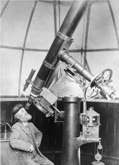 Рис. 3.13. Английский астроном Чарльз Гровер (1842–1921) у своего рефрактора, укрепленного на экваториальной монтировке. Вращение вокруг полярной оси осуществляется через приводной вал гиревым часовым механизмом, скорость которого контролирует регулятор Уатта (его шары видны в прозрачной верхней части кожуха). Астроном сидит на лесенке с выдвигающимися ступенями-сиденьями, высота которых подбирается в зависимости от положения окулярного конца телескопа.