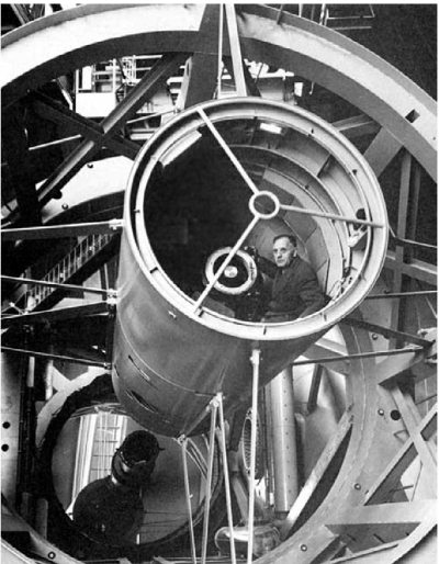 Рис. 3.20. Рабочее место астронома (на фото Эдвин Хаббл) в «стакане» главного фокуса Паломарского телескопа. Внизу видно 5-метровое «око» телескопа.
