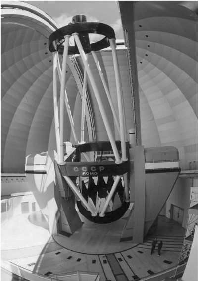 Рис. 3.21. 238-дюймовый телескоп БТА Специальной астрофизической обсерватории РАН. На боковые площадки его монтировки выведены фокусы Несмита.
