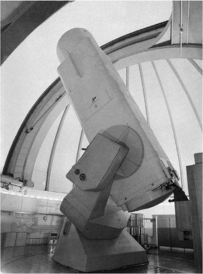 В 1917 г. на обсерватории Маунт-Вилсон начал работать 100-дюймовый (2,5 м) рефлектор «Хукер», остававшийся крупнейшим в мире до 1948 г. Его зеркало, оплаченное американским меценатом Дж. Хукером, отлили во Франции, а полировал его с 1910 по 1915 гг. знаменитый американский оптик и конструктор телескопов Джордж Ричи (1864–1945). Труба телескопа была укреплена во вращающейся прямоугольной раме, игравшей роль полярной оси. Имеющая две опоры – на северном и южном концах, такая монтировка (ее называют английской) обладает высокой прочностью, но не позволяет наблюдать звезды вблизи полюса. Этот телескоп знаменит тем, что на нем впервые был измерен размер некоторых звезд (А. Майкельсон и Ф. Пиз, 1920–1923 гг.) и с его помощью Э. Хаббл осуществил большинство своих исследований в «царстве туманностей». В 1985 г. работа на телескопе была прекращена, но его решили сохранить как реликвию. Однако в 1992 г. он был модернизирован и вновь стал использоваться.