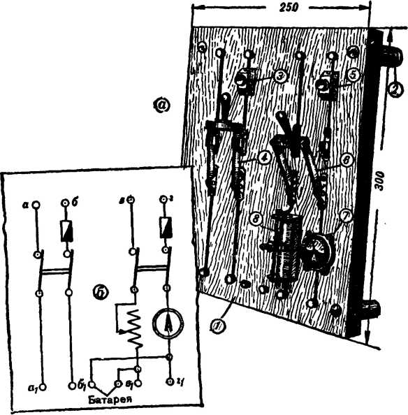 Простейший электрический щиток и его схема показаны на рисунке 82. Он состоит из деревянного основания 1, прикрепленного к стене при помощи роликов 2. К щитку подводятся две сети низкого напряжения: с левой стороны проложена сеть переменного, а с правой — постоянного тока. В сеть переменного тока включены предохранительная пробка 3 и двухполюсный рубильник 4. На входные зажимы а и б подается ток переменного напряжения от понижающего трансформатора, а приборы и модели переменного тока присоединяются к выходным зажимам а1 и б1.