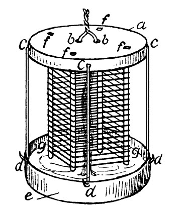 Устраивается она так. Деревянный или эбонитовый кружок а (рис. 31), с отверстиями b для ввода концов проводов сильного тока, соединяют тремя отрезками проволоки cd с жестяной чашечкой е. В том же кружке укрепляют четыре деревянные спички fg, образующие рамку для обмотки тонкой (0,5 мм) круппиновой или нейзильберовой изолированной проволокой. Проволока наматывается двумя параллельными обмотками, не соприкасающимися друг с другом. Каждая из двух обмоток верхним концом соединяется с одним из проводов тока – нижние же их концы оставляют свободными. Внутрь такой проволочной призмы вводят бумажный фитиль, вверху укрепленный в центре кружка а, а снизу опущенный в подсахаренную воду, пиво, квас или другую жидкость, налитую в чашку е и привлекающую лакомок-мух.
