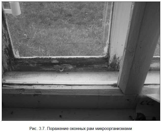 В моем «зимнем» доме установлены по две рамы на окно. Плесень (поражение микроорганизмами) между рамами (рис. 3.7) является следствием проникновения воздуха и сырости сквозь рамы, неплотно прижатые к оконной коробке (подрамнику). Для уменьшения воздействия конденсата и предотвращения гниения я соблюдаю между двумя стеклами (рамами) оптимальное расстояние в 40 мм.