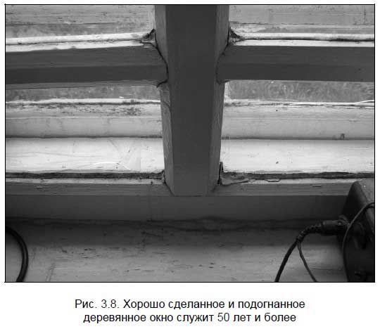 На штатные места окна монтировались в сухую и холодную погоду (+10 °C) — это снижает риск появления конденсата, поскольку воздух, образовывающий воздушную подушку между стеклами рам, при таких условиях имеет наименьший показатель влажности. После правильного монтажа (рис. 3.8) окна не «болеют плесенью» и служат долго.