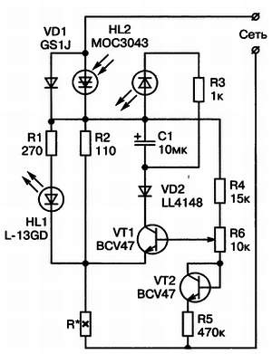 Путь прохождения тока паяльника различен для разных полуволн сетевого напряжения: положительная полуволна проходит через диод VD2, отрицательная — через оптосимистор HL1. Резисторы R2, R* (нагреватель паяльника), R4, R5 и R6 образуют мост, в диагональ которого включен транзистор VT1. Измерение сопротивления нагревателя происходит только на положительных полуволнах сетевого напряжения. Если паяльник холодный, сопротивление нагревательного элемента мало, мост разбалансирован, и через цепочку VT1, VD2 заряжается конденсатор С1. Напряжение на нем достаточно для открывания оптосимистора HL1. Паяльник нагревается полным током. По мере его нагрева сопротивление нагревательного элемента паяльника увеличивается, мост приходит в состояние баланса, в результате чего транзистор VT1 закрывается. Напряжение на конденсаторе С1 падает ниже напряжения открывания оптосимистора. Паяльник оказывается подключенным к сети только на положительных полуволнах напряжения, в результате чего выделяемая на нем мощность уменьшается вдвое, что, как показывает практика, вполне достаточно для регулирования температуры. Благодаря применению моста устройство поддерживает стабильную температуру жала независимо от колебания напряжения сети и интенсивности пайки.