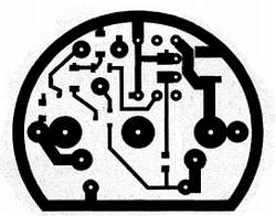 Устройство собрано на печатной плате диаметром 33,75 мм из одностороннего фольгированного стеклотекстолита толщиной 1,5 мм с частично срезанным сегментом. Чертеж печатной платы в зеркальном изображении приведен на рис. 9.2 (он также есть на прилагаемом диске в разделе «Приложения», файл trp.dxf), схема расположения элементов — на рис. 9.3, внешний вид — рис. 9.4.
