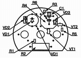 В конструкции применены резисторы для поверхностного монтажа типоразмера 0805, кроме R2 — типа МЛТ-0,5. Конденсатор С1 — танталовый для поверхностного монтажа. Транзисторы VT1 и VT2 можно заменить любыми маломощными n-р-n с допустимым 1К не менее 100 мА и как можно большим Вст. Диод VD1 можно заменить любым, рассчитанным на номинальный ток нагрузки и обратное напряжение не менее 400 В. В качестве переменного резистора регулятора температуры R6 автором применен импортный подстроечный резистор с полиэтиленовым шлицом (что позволило обойтись без ручки настройки), но его можно заменить любым, подходящим по габаритам. Светодиод — любой видимого спектра.