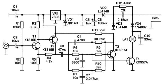 Звуковой сигнал поступает на вход предварительного усилителя на транзисторах T1, T2. С выхода усилителя сигнал через разделительные фильтры поступает на базы транзисторов Т4, работающих в режиме активных АМ-детекторов. Лампы накаливания включены в коллекторные цепи транзисторов. Транзистор ТЗ предназначен для установки режимов работы транзисторов Т4, оптимальных для детектирования сигнала.