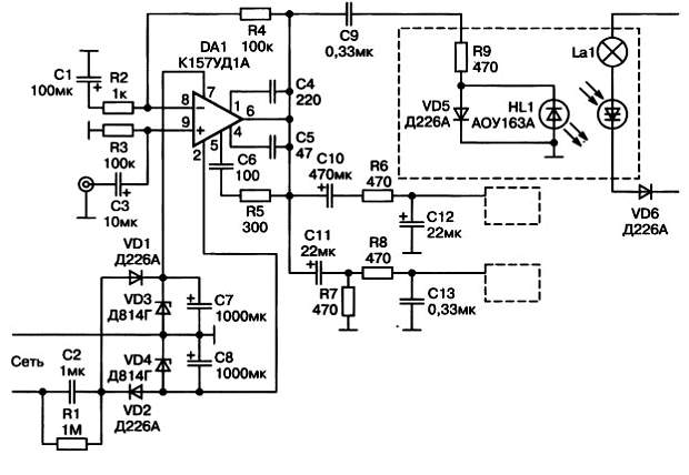 Звуковой сигнал поступает на вход микросхемы DA1, где усиливается и через разделительные фильтры поступает на светодиоды симисторных оптопар HL1. Диоды VD5 обеспечивают «детекторный» режим работы светодиода оптопары, пропуская через себя один полупериод входного сигнала.
