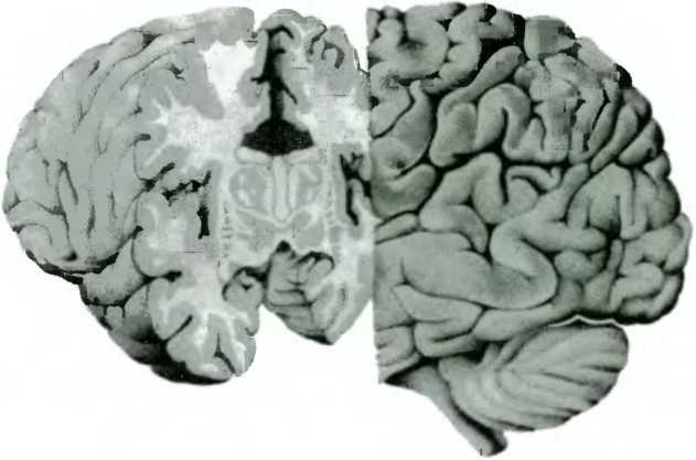Рис. 68. Разрушение меж-полушарных связей при лечении эпилепсии: иссеченное мозолистое тело показано темным цветом