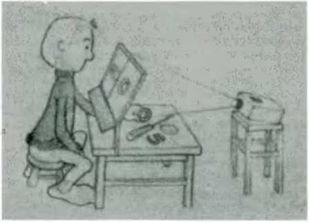 Рассмотрим пример Прооперированного пациента попросили сесть перед проекцией. Не отрывая взгляда от точки фиксации, он должен выбрать из множества предметов, которое не может видеть непосредственно, тот, который соответствует изображению, спроецированному на зкран (рис. 71). Если ложка спроецирована слева от точки фиксации (следовательно, на правое полушарие), то прооперированный пациен'г без труда выбирает ложку из невидимого для него набора предметов. Если же мы вместо ложки