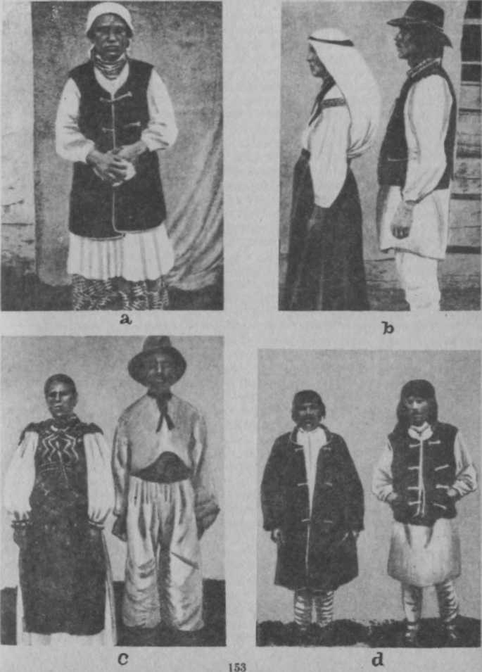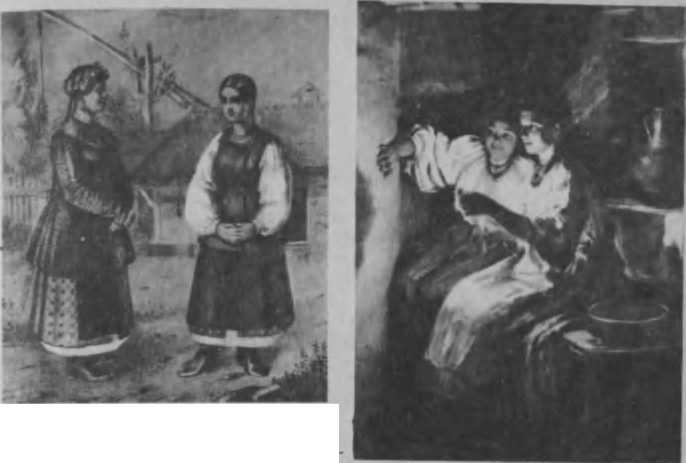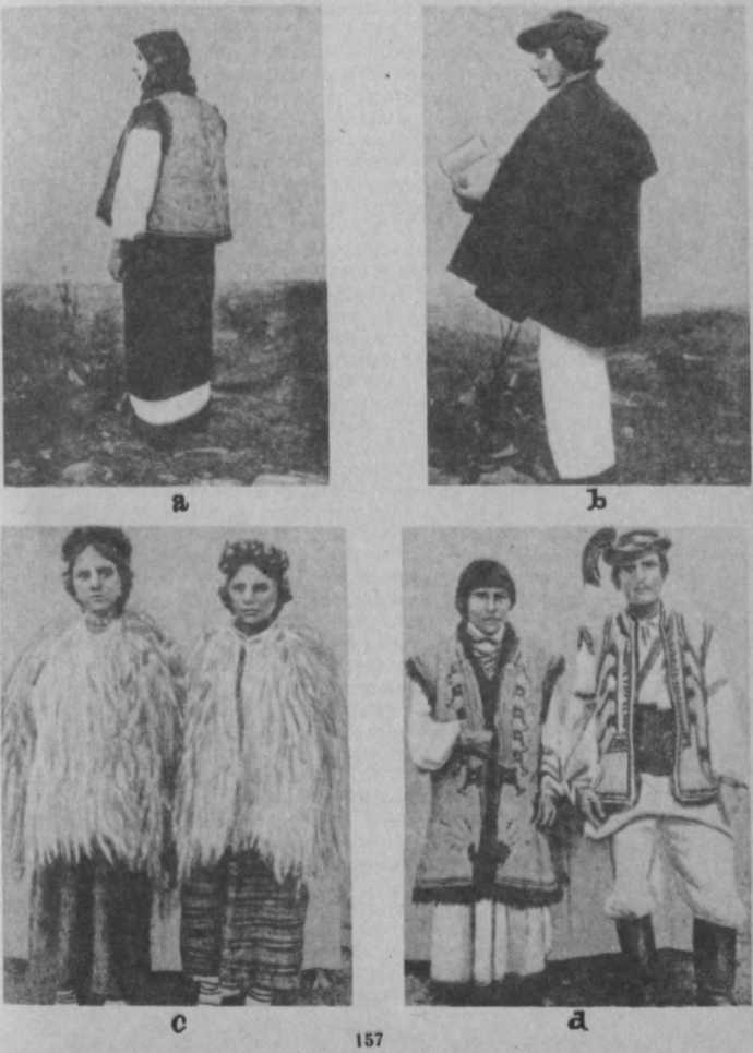 З тих часів у цьому костюмі утворилось та утворюється чимало ріжних змін та варіяцій (звичайно в подробицях), що з них ми вкажемо тільки на один, дуже цікавий факт. У 70-х роках минулого століття, одночасно з швидким розвитком українського руху, а між иншим і українського театру, в інтелігентних колах суспільства витворився більш-менш умовний тип «українського костюма», що в суті своїй досить-таки далеко відходив од етнографічної дійсности. Пройшло коло 40 літ, і, переїжджаючи кілька часу тому пароплавом Десною, ми були досить-таки здивовані, бачачи, від Київа до самого Новгорода-Сіверська включно, всіх місцевих дівчат у типових «українських костюмах», що дуже живо нагадували нам хор у «Різдвяній ночі» небіжчика М. В. Лисенка (табл. IV, d). Костюм цей, явна річ, пройшов на село та акліматизувався там до таких курйозних подробиць, як перевага на вишитих рукавах сорочок візерунків, скажемо, троянд-центифолій або винограду з листям та в китицях, що ніколи і нігде не були на Україні народніми, принаймні у тій формі, в якій вони (для сценічних потреб) ввійшли в моду в Киї-ві, а тепер поширилися на Чернигівщині та в багатьох инших місцевостях. Але і разом з тим, і значно в більшій мірі, йде заміна українського на-роднього жіночого костюма на міський міщанський, цебто кепський варіянт загальноєвропейського костюма. Такі та ще й инші зміни костюма, що їх спостерігає етнографія, звичайно, завше були й будуть, і можливо, що, через фабричну продукцію, ці зміни приведуть до більш-менш загальної заміни національних костюмів на всесвітньо модні; але коли це й станеться, то в усякім разі не можна ручитися, що в дальшому не настане нова дифе-ренціяція одежі, бо ж вимоги смаку щодо гармонії барв та ліній не можуть бути скрізь однакові. Про ці вимоги, що їх закони будуть, колись з’ясує психологічна етнографія, яка ще тепер не існує, ми тепер говорити не можемо, але не можемо й не зважати на їх існування.