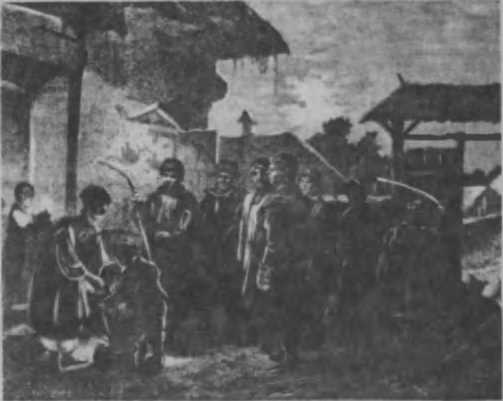 Сватання. Скоро питання про шлюб між молодими людьми вирішене, наречений звертається до своїх батьків з проханням послати сватів до батьків нареченої. У свати запрошують двох досить літніх та поважаних господарів, і принаймні один з них мусить бути родичем нареченого, найчастіше його дядько. В призначений час, майже завше ввечері, свати, чи старости, взявши з собою хліб, пляшку горілки та конче палиці в руки— як знак своєї посольської місії,— вирушають до хати нареченої. Дуже часто разом із ними йде і наречений зі своїм дружком. Постукавши у вікно, вони просять, щоб їх пустили до хати, посилаючись на пізню годину та на свою втому з дороги. В хаті починається нарада, чи впускати, чи не пускати, і, звичайно, вирішують питання позитивно. Жених з дружком зостаються завше в сінях та починають розшукувати наречену, що її мати обачно вже вислала з хати, а старости входять до хати та, після звичайного привітання, виймають з мішка хліб, цілують його та віддають господареві. Той також цілує хліб та кладе його на стіл і питається старостів, хто вони такі та куди йдуть. Тоді старости починають оповідати небувалу історію, що ніби вони мисливці, гнали куницю та запримітили, що вона сховалась у цій хаті, та що вони бажають знайти її... їм одповідають висловом недовір’я та пропонують іти собі геть по-добро-му... Тоді старости проголошують, що сила на їхньому боці, бо вони в запасі мають ще двох козаків у сінях, та кличуть жениха з дружком. Ті входять і тягнуть за собою й наречену, що відповідно проїипиіься такому насильству. Тоді свати звертаються до матері нареченої з прямою пропозицією віддати дочку за їхнього парубка ІЖених тим часом стоїть біля входу до хати, в тому місці, де стоять коцюби, а наречена, засоромившись, має відійти до печи — домашнього вогнища — та колупати її нігтем. Вислухавши пропозицію, мати звертається до батька, а потім вони обоє разом питаються у дочки: чи піде вона за пропонованого жениха? Після спосилання на волю батьків та умовлянь з їхнього боку, щоб вона сама висловилась, дочка нарешті дає згоду, а тоді батько наказує принести що-небудь, «щоб пов'язати цих волоцюг та насильників» Невіста приносить рушники, давно вже приготовані для цього, пов'язує ними старостів через плече, а женихові затикає вишивану хустку за пояс Потім сватам дають хліб, і церемонія кінчається на тому, що свати виймають з-за пазухи пляшку з горілкою, частують господарів та змовляються про час заручин. Потім усі розходяться, а жених з цього часу має право відкрито приходити до нареченої та проводити з нею ночі. Цим кінчається перший акт весільних обрядів; другий — заручини, це вже трохи урочистіше повторення тої самої церемонії сватання; він має вже важливі, ше, так би мовити, юридичне значення, бо коли жених відмовиться післц заручин, то це вважають за образу, і справа дуже часто кінчається иа суді.