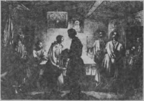 1 дійсно, справджуючи цю пісню, що так живо нагадує змістом доісторичний культ, а мовою— «Слово о полку Ігореві», молодий не зразу входить до двору, а в оточенні своїх товаришів спиняється перед входом. Молода звертає увагу своєї матері на коней, шо коло воріт іржуть, та просить заховати її, на що мати відповідає їй, шо «не з тим ці чужі люде йдуть, щоб вернутись без тебе», та просить усіх зайти до хати. Молодий та дружко входять до хатн, не здіймаючи шапок, що у звичайний час вважалось би за найбільшу непристойність; їх частують горілкою, а старша дружка просить у старостів благословення пришити вінок до шапки молодого. Коли вінок пришито, подають обідати, потім танцюють і пізно вночі розходяться, крім, ясна річ, молодого, що зостається з молодою.