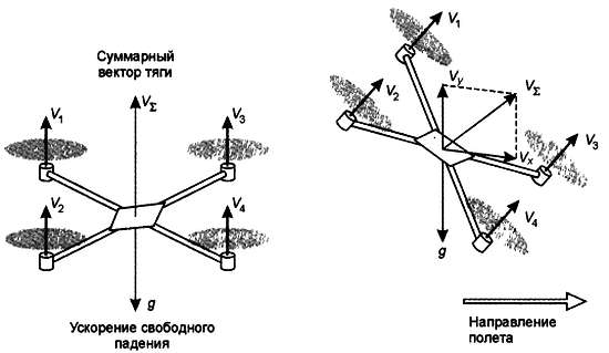 Воздушные винты, расположенные на диагональных лучах рамы, создают суммарную вертикальную тягу. Синхронно регулируя обороты моторов, можно заставить квадрокоптер подниматься вверх, зависать или опускаться. Если изменить обороты моторов неравномерно, то квадрокоптер отклонится от горизонтального положения и полетит в сторону отклонения. Например, при увеличении оборотов двух задних моторов его задняя часть приподнимется и квадрокоптер полетит вперед. За счет неравномерного изменения оборотов всех моторов квадрокоптер способен лететь в произвольном направлении.