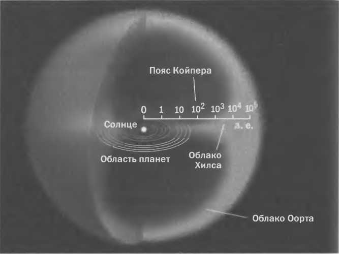 Рис. 7.9. Строение Солнечной системы по современным представлениям. Кометы в облаке Оорта слабо связаны с Солнцем и подвержены гравитационному влиянию окружающих звезд и других массивных объектов. Поэтому они часто покидают Солнечную систему, но эти потери компенсируются кометами из значительно более населенного облака Хилса, иначе называемого поясом Хилса или внутренним облаком Оорта.