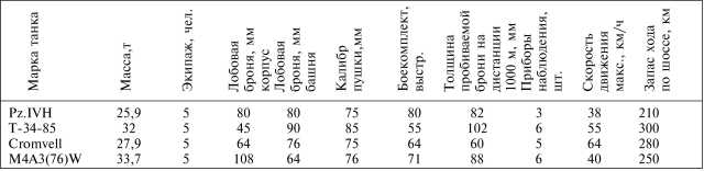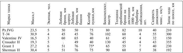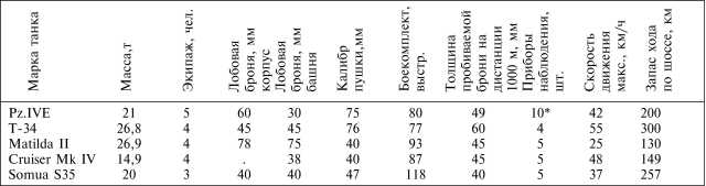 С этой целью попытаемся сравнить «четверку» с противостоявшими ей в разные периоды Второй мировой войны советскими, английскими и американскими танками. Начнем с первого периода — 1940–1941 годы; при этом не станем ориентироваться на тогдашнюю немецкую классификацию танков по калибру пушки, относившую средний Pz.IV к классу тяжелых. Поскольку у англичан не было среднего танка как такового, то придется рассматривать сразу две машины: одну — пехотную, другую — крейсерскую. При этом сравниваются только «чистые» заявленные характеристики, без учета качества изготовления, эксплуатационной надежности, уровня подготовки экипажей и т. д.