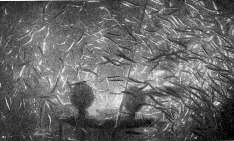 В дальневосточных морях советские рыболовные суда применяют комбинированный метод лова сайры, из которой приготовляют хорошо всем известные бланшированные консервы (приготовленные на пару). Ночью по всему борту судна зажигаются яркие лампы синего света. Такой свет проникает глубоко в воду. На него со всех сторон собирается сайра. Синий свет гасят и зажигают прожектор красного света, образующий на воде красное пятно. Красный свет неглубоко проникает в воду, и рыба устремляется к красному пятну на поверхности. Тогда в воду опускают приемную трубу насоса, находящегося под электрическим током. Корпус судна служит катодом, насос - анодом. Электрическое поле притягивает рыбу, а насос выкачивает ее с водой на палубу судна. При благоприятных условиях добывают центнер рыбы в минуту. Такова новая техника лова мелкой стайной рыбы.