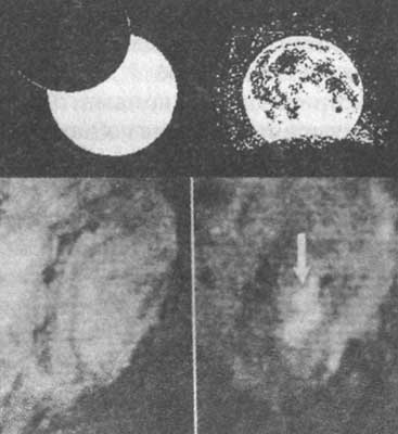 Рис. 14. Облака пыли над Луной: «усы света» вдоль края Луны во время солнечного затмения 17 июня 1890 года (вверху слева); тень Земли на пылевой оболочке Луны во время лунного затмения 16 июля 1954 г. (вверху справа); нормальный вид кратера Лангрен 29 декабря 1992 г. (внизу слева) и тот же кратер через сутки с облаком пыли (внизу справа).