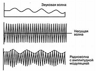 Поскольку физический размер антенны пропорционален длине волны, использование этого устройства для приема и передачи электромагнитных колебаний в звуковом диапазоне может быть непрактичным. Поэтому высокочастотная волна, выработанная генератором, смешивается с низкочастотной звуковой волной. При этом образуется модулированная волна, которая используется для транспортировки информации от передатчика к приемнику. На рис. 6.1 показан принцип амплитудной модуляции, при котором информация, то есть сигнал низкой звуковой частоты, изменяет амплитуду сигнала-носителя. Амплитудно-модулированная волна представляет собой комбинированный сигнал носителя, а также верхней и нижней боковой полосы частот.