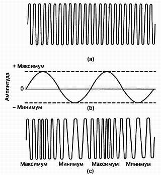 Технология передачи с использованием частотной модуляции (ЧМ) начинается с несущей волны радиочастоты и волны звуковой частоты, называемой модулирующим сигналом. Когда несущая радиочастота модулируется звуковым сигналом, частота несущей радиоволны изменяется вместе с амплитудой модулирующего сигнала (рис. 6.3).
