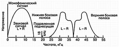 Подавленная несущая 19 кГц также передается как часть комплексного сигнала для синхронизации и восстановления частоты 38 кГц в приемнике при демодуляции. Цель подавленной несущей заключается в уменьшении энергии в комплексном стереосигнале для оптимального отношения сигнал/шум. сигнал в частоту 38 кГц. Выходной сигнал 38 кГц представляет собой точную копию подавленной несущей частоты с двумя боковыми полосами.