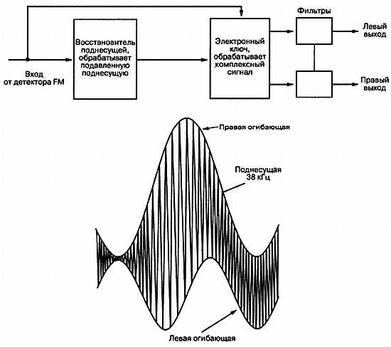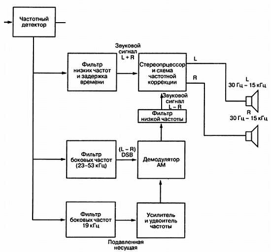 При пропускании сигнала L — R и сигнала 38 кГЦ через нелинейную схему демодулятора AM получаются суммы и разности сигналов, один из которых представляет собой сигнал L — R (в диапазоне от 30 ГЦ до 15 кГЦ), выделенный низкочастотным фильтром. Сигналы L — R и L + R подаются на стереодекодер и обрабатываются, как показано на рис. 6.10.