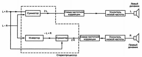 Обратите внимание, что один канал складывает L + R и L — R и дает в результате сигнал L. Сигнал L — R проходит через фазовый инвертор, который изменяет знак L — R на — L + R. Сигналы L + R и — L + R складываются, формируя сигнал R. Сигналы R и L подаются на соответствующие усилители и затем на динамики.