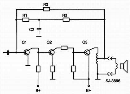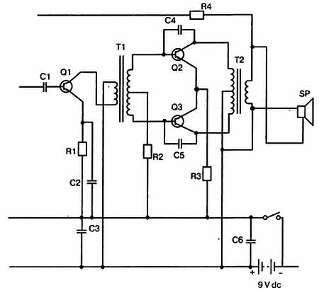 Конденсатор С2 и резистор R1 представляют собой эмиттерную RC-цепь, которая обеспечивает режим смещения транзистора по постоянному и переменному току. Трансформатор Т1 разделяет на 180° фазу сигналов, управляющих Q1 и Q3. Транзисторы двухтактного каскада усиливают сигнал по очереди, каждый свою полуволну, которые затем складываются на выходе. Конденсаторы С4 и С5 передают часть сигнала с коллектора назад на базу транзистора. Эта отрицательная обратная связь предотвращает переход транзисторов в колебательный режим и уменьшает искажения. Трансформатор Т2 согласовывает импеданс Q2 и Q3 с динамиком. Конденсаторы С3 и С6 представляют собой емкостные фильтры для развязки каждого каскада от паразитных и нежелательных сигналов в линии питания.
