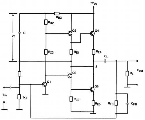 Верхняя пара n-р-n-транзисторов Q2, открыта, когда сигнал на выходе Q1 положительный, нижняя пара р-n-р транзисторов Q3 и Q5, открыта при отрицательном сигнале. Обе полуволны выделяются на нагрузке RL, обеспечивая двухтактную работу.