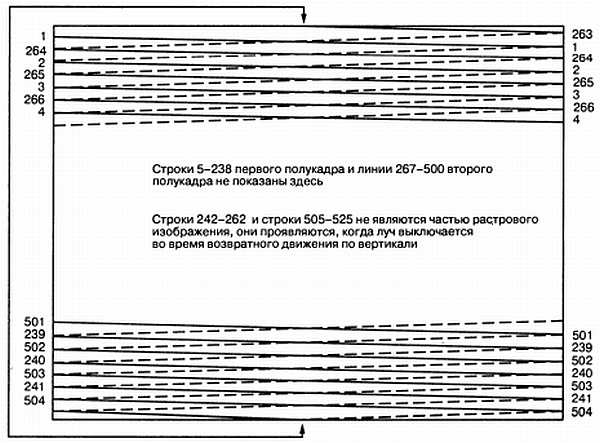 Луч возвращается с нижней части экрана назад в центр самой верхней части и завершает сканирование четных линий. Каждый набор четных или нечетных линий образует поле, а оба вместе образуют кадр. Поэтому в кадре 625 линий при частоте 25 кадров в секунду.