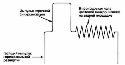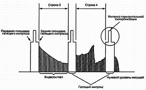 Рис. 6.17. Упрощенный вид видеосигнала, показывающий гасящие импульсы и импульсы горизонтальной развертки