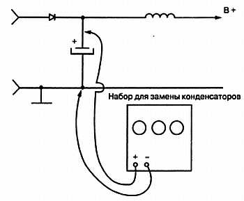 При поиске неисправностей радио- и звукового оборудования используется несколько методов. Например, работая с супергетеродинным приемником, начните с осмотра и прослушивания. Поищите очевидные признаки поломки. Если приемник гудит, наиболее вероятно, что у него неисправен фильтрующий конденсатор в цепи питания. Проверьте неработающий компонент, шунтировав его заведомо исправным такой же величины, или с помощью набора конденсаторов, как показано на рис. 6.19. Если гул исчезнет, замените фильтр.