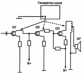 Сначала подключите генератор низких частот или генератор шума к каждому каскаду приемника, соединив землю прибора с шасси приемника. Начните с подачи сигнала около 400 Гц на динамик. При этом должен быть слышен тональный сигнал. Это значит, что динамик работает. Перейдите к каскаду усилителя. Подайте сигнал на базу его транзистора. Перейдите к следующему каскаду по направлению к детектору, когда услышите тоновый сигнал. Подавая сигнала в детектор или в антенну, используйте сигнал высокой частоты. Если при этом тоновый сигнал не слышен, можно сделать вывод, что именно этот каскад вышел из строя. В этом случае проверьте сопротивление каждого компонента, чтобы выявить неисправный.