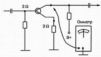 Рис. 6.23. Измерение сопротивления коллектора транзистора с помощью омметра