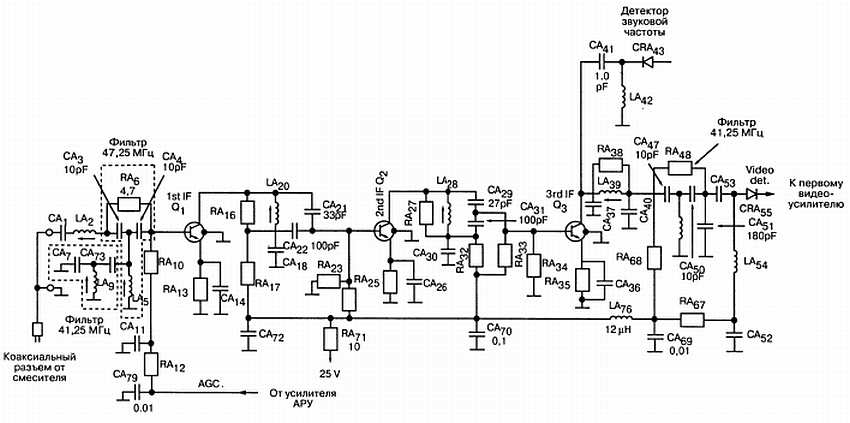 После коррекции предыскажений звуковой сигнал усиливается каскадом усиления низкой частоты для подачи на динамик. Обратите внимание на наличие каскада автоматической регулировки частоты (АРЧ), который поддерживает правильную настройку гетеродина приемника.