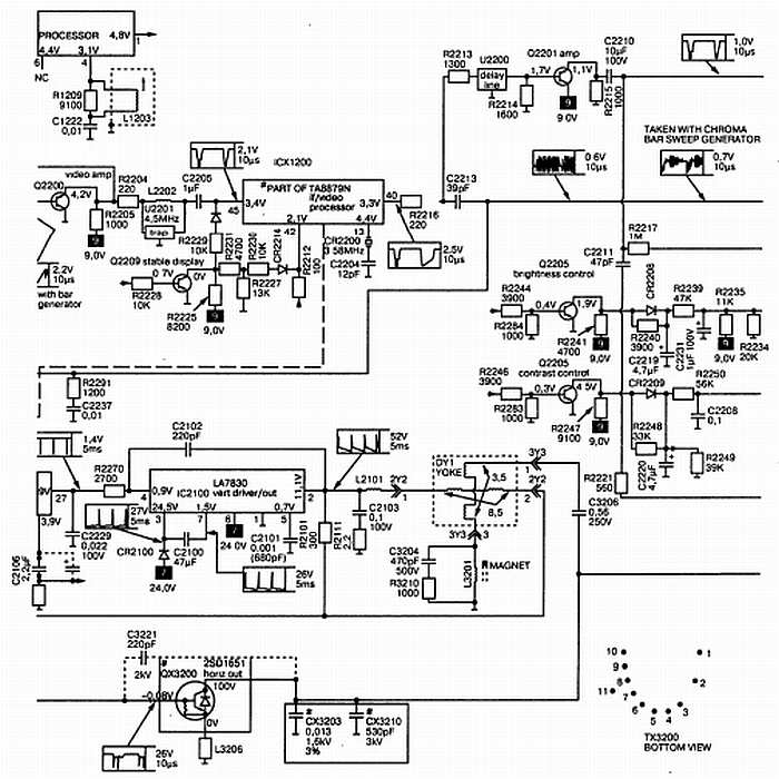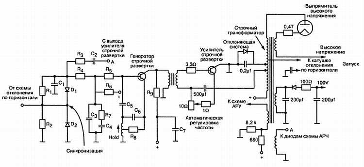 Автоматическое управление усилением поддерживает постоянный уровень сигнала. Схема выделения сигналов синхронизации выбирает импульсы синхронизации по вертикали и горизонтали и подает их на схемы интегрирования и дифференцирования. Интегрирующая схема формирует импульсы синхронизации по вертикали в виде серии импульсов пилообразного напряжения и подает их на генератор вертикального отклонения. Усилитель вертикального отклонения управляет током вертикальной отклоняющей катушки и обеспечивает вертикальную развертку. Дифференцирующая схема формирует импульсы синхронизации по горизонтали и подает их на генератор горизонтальной развертки и схему автоматической подстройки частоты. Импульсы горизонтальной развертки выделяются схемой автоматической регулировки частоты (АРЧ). Они усиливаются и используются для управления горизонтальной отклоняющей катушкой, которая обеспечивает развертку по горизонтали.