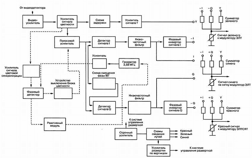 Описание схемы современных телевизионных приемников различается в зависимости от производителя. Большинство используют микропроцессор, который взаимодействует со средствами управления и видеопроцессором. Многие видеопроцессоры содержат набор следующих функций: