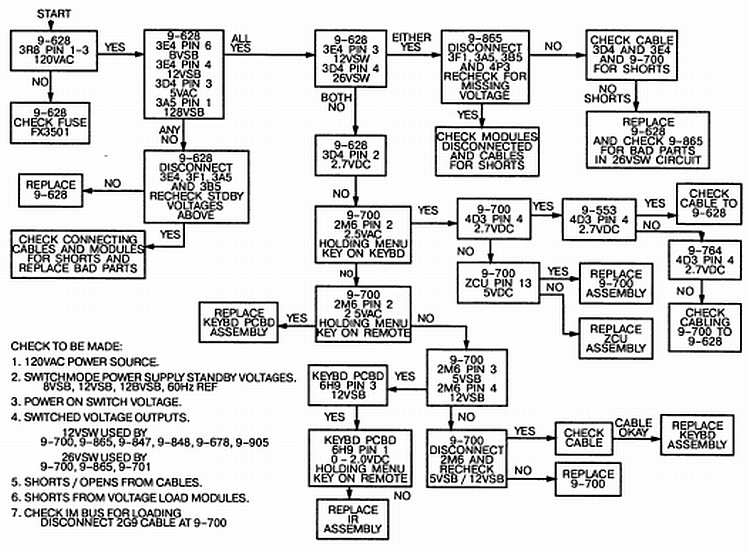Когда устройство не подает признаков жизни, проверьте включатель омметр ром, предварительно отсоединив устройство от сети питания. Используйте омметр также для проверки плавкого предохранителя, диода источника питания, термистора и обмотки дросселя фильтра. Любой из этих компонентов мог вызвать обрыв в цепи (рис. 6.20).