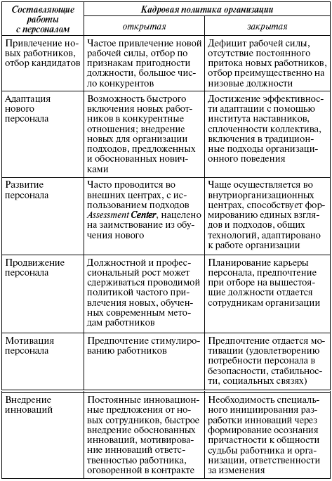 По признаку ориентации организации на внутреннее или внешнее поле своих интересов при формировании персонала и кадрового потенциала кадровая политика может быть открытой или закрытой (табл. 3.12).
