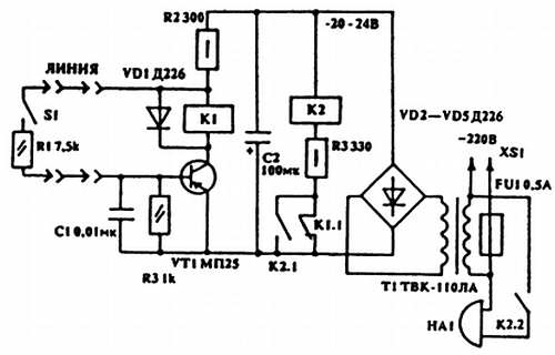 Резистор R1 вмонтирован в корпус концевого выключателя S1, который устанавливается на двери охраняемого помещения. Когда дверь закрыта, контакты выключателя замкнуты, транзистор VT1 открыт, и срабатывает реле К1. Контакты этого реле прерывают цепь питания реле К2. При попытке открыть дверь или при обрыве линии транзистор VT1 запирается, реле К1 отпускает, контакты К1.1 замыкаются, включая реле К2, которое своими контактами К2.1 становится на самопитание, а контактами К2.2 включает звонок.