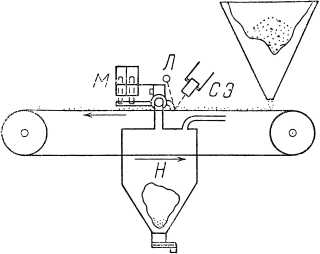 Фотоэлектрический обогатитель руды. Л — лампа; СЭ — селеновый элемент; М — электромагниты; Б — бункер с рудой; Н — второй бункер с обогащенной рудой.